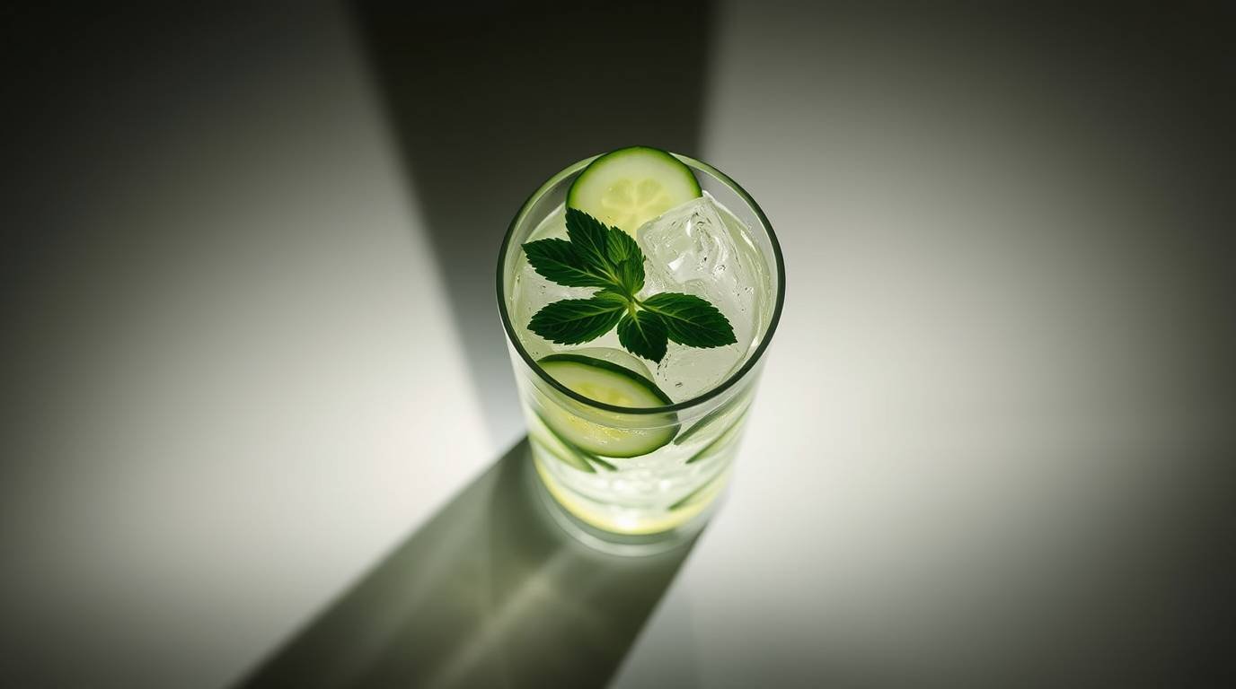 Serve in a tall glass with cucumber ribbons and crushed ice.