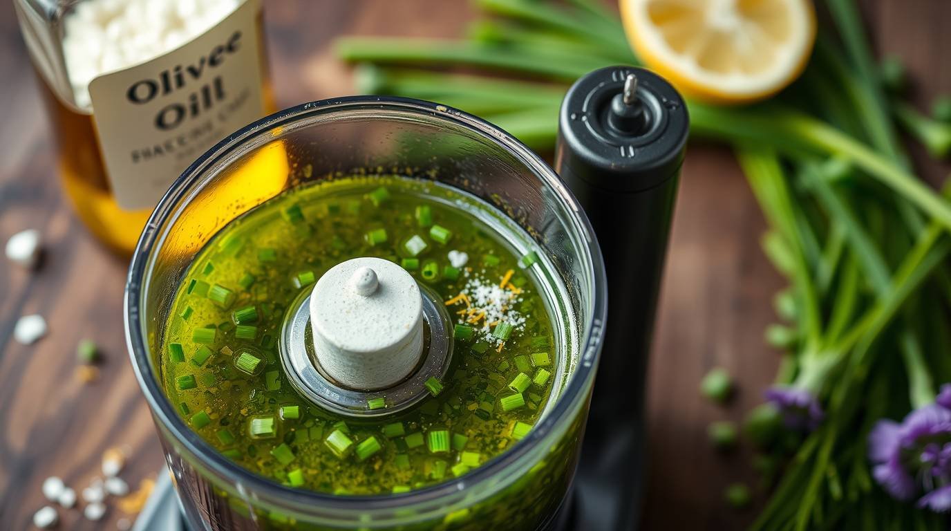 In a small blender or food processor, combine 1 cup of fresh chives with 1/2 cup of olive oil. Blend until the chives are finely chopped and the oil takes on a vibrant green color.