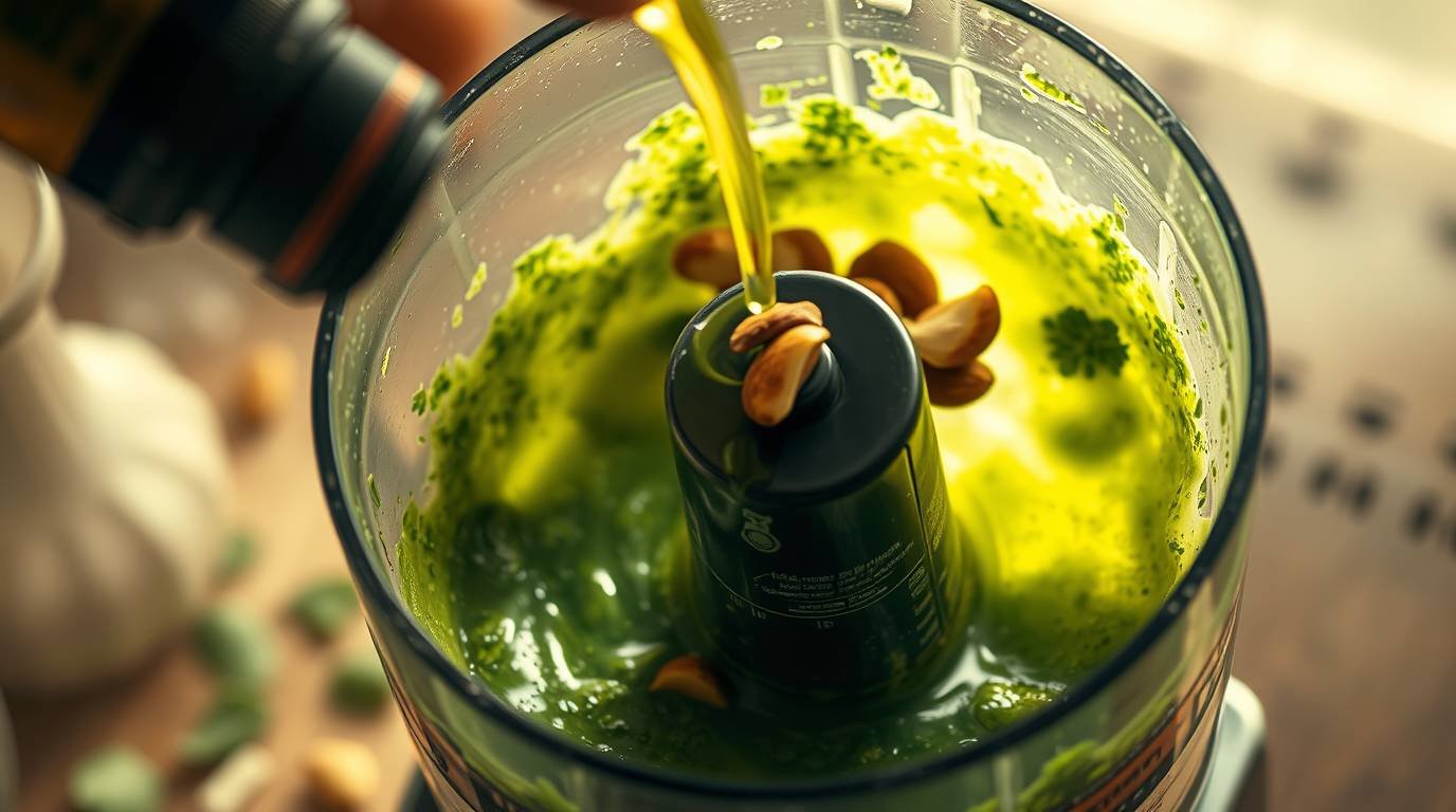 Add the crushed garlic clove, lemon juice, and toasted almonds or walnuts to the processor. Blend while slowly drizzling in the extra virgin olive oil until smooth.