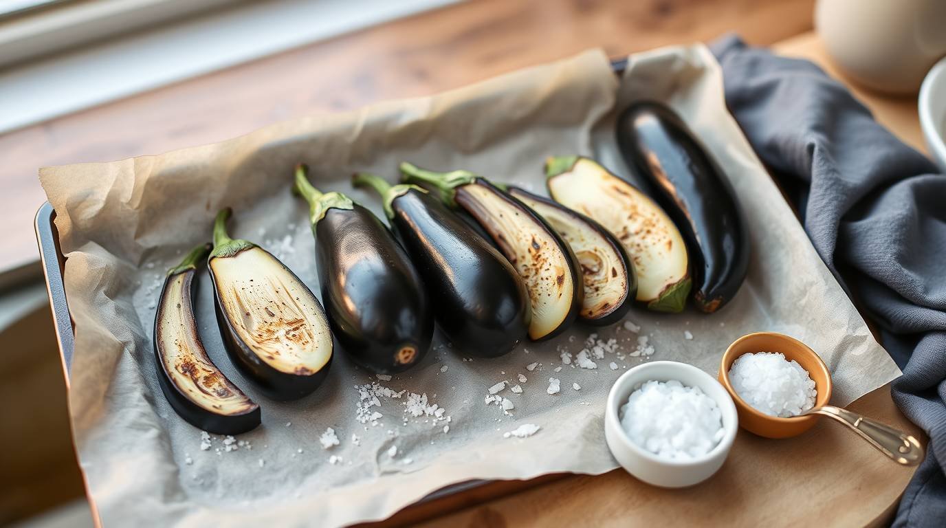 Lay the eggplant slices on a baking sheet, sprinkle generously with salt, and let them sit for about 30 minutes.