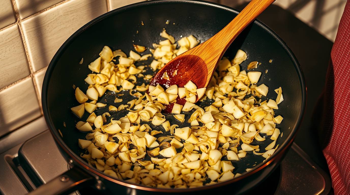 1. Heat olive oil in a saucepan over medium heat. Add chopped onions and garlic, cooking until fragrant and translucent.