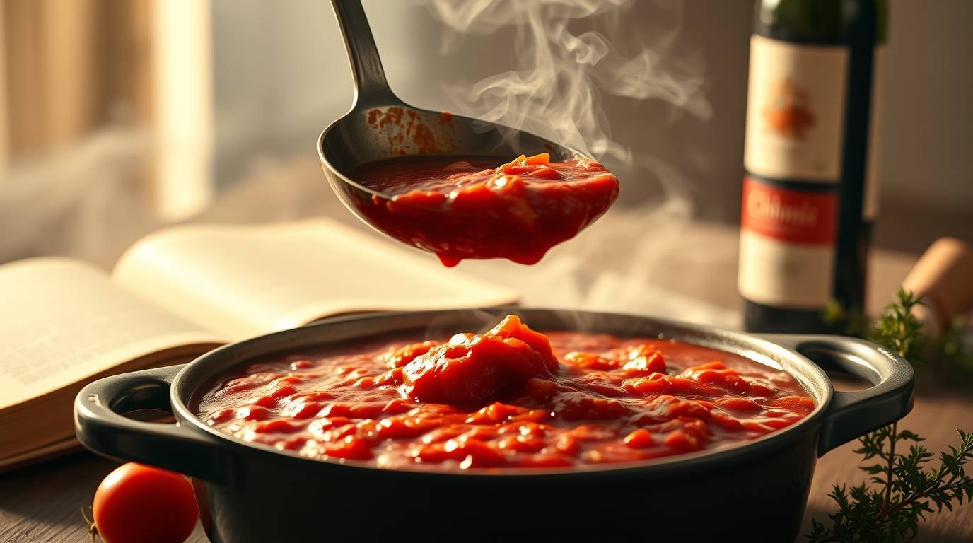 A ladle hovers above a rich tomato-wine sauce, steam curling upward. In the background, a half-empty bottle of Chianti, open cookbook, and a sprig of oregano resting on a cutting board set the mood.