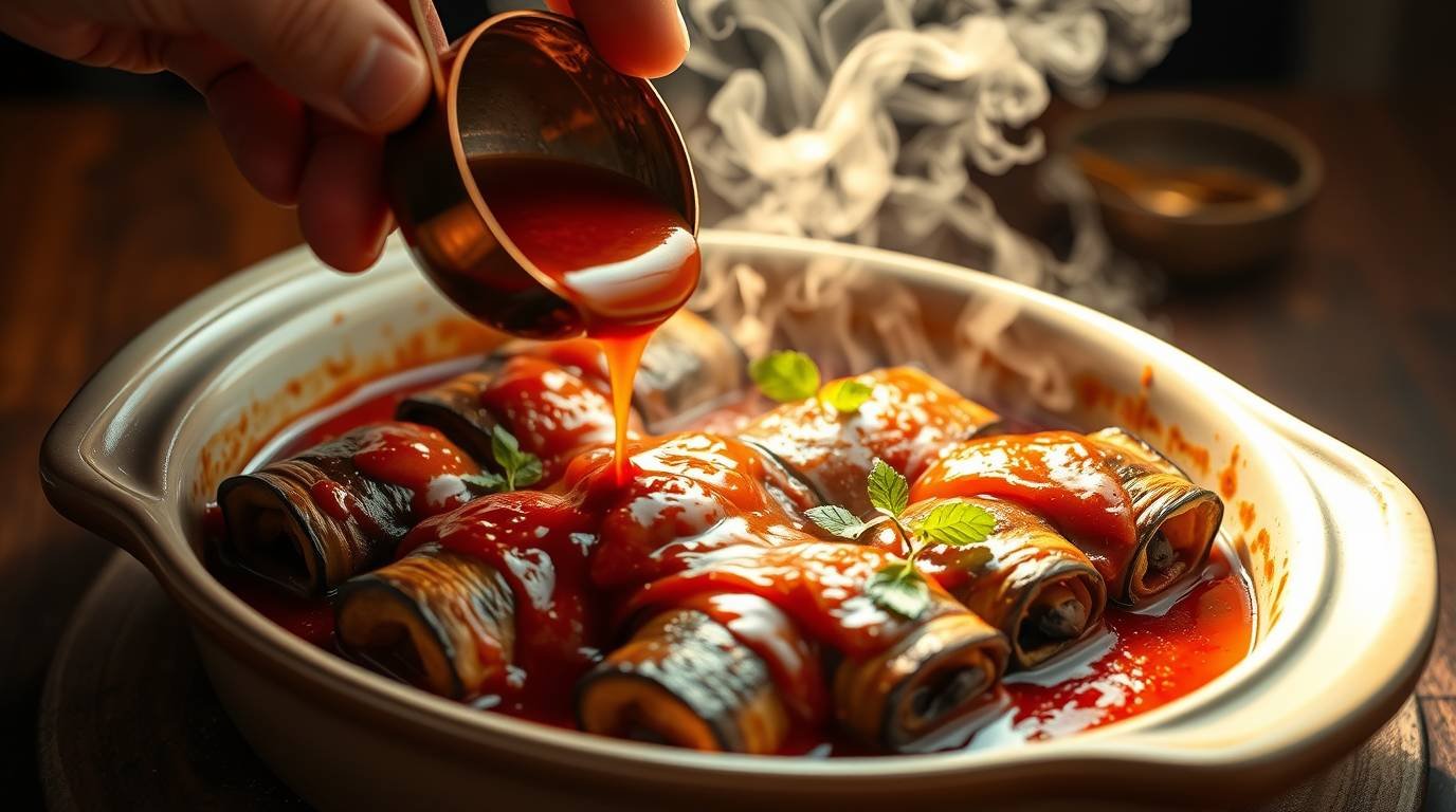This dish is not just about the sum of its parts; it’s about the symphony they create together. The eggplant becomes the perfect vessel, its flesh tender and yielding after a gentle roast. Each roll envelops a dollop of smoked ricotta, rich and creamy, with a hint of smokiness that teases the senses. The tomato-wine sauce, simmered to perfection, provides a tangy, slightly sweet backdrop that ties everything together, its acidity cutting through the richness of the ricotta, creating a dish that’s as balanced as it is bold.