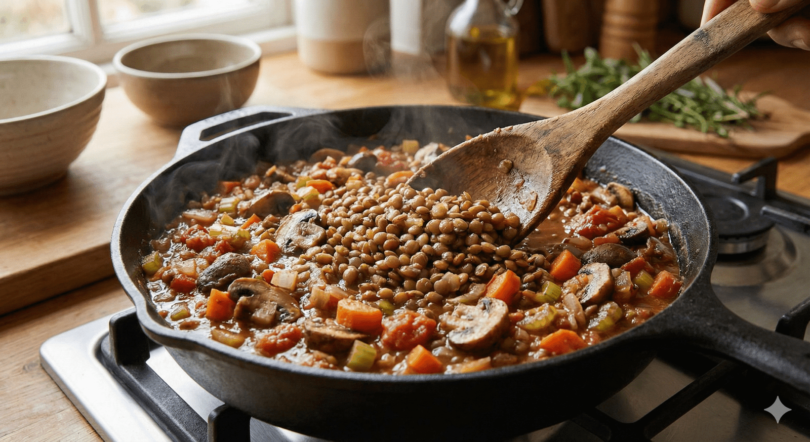 Savor the robust flavors of mushrooms, lentils, and a splash of red wine in this vegetarian ragù, ideal for pairing with rigatoni.