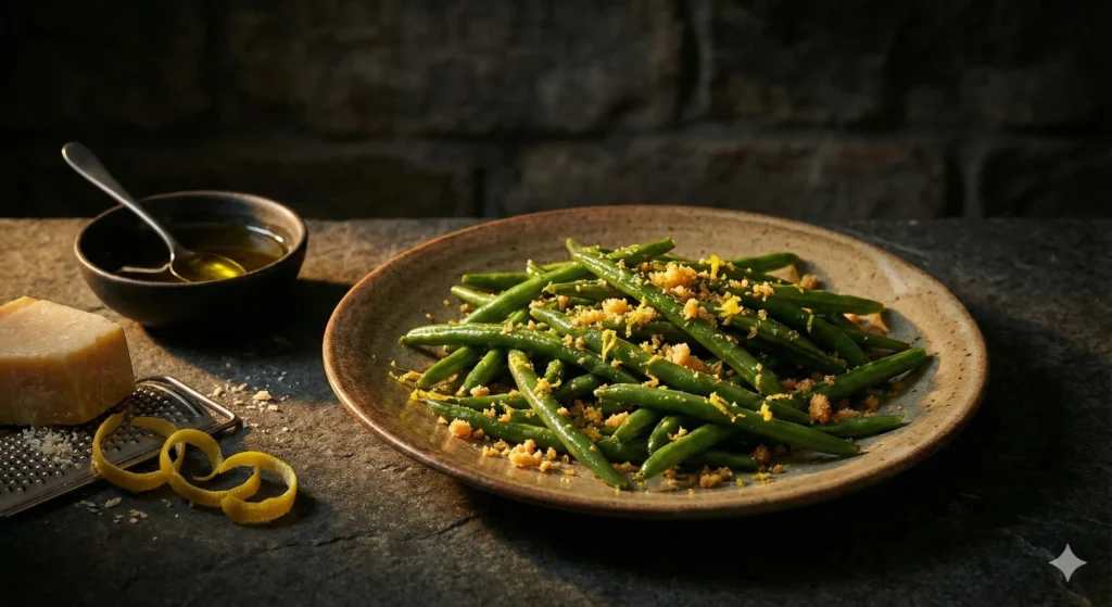 A fresh and zesty side dish that brings the sunny flavors of Sicily to your table, combining crisp green beans with a delightful crunch of Parmesan crumbs and a hint of lemon.