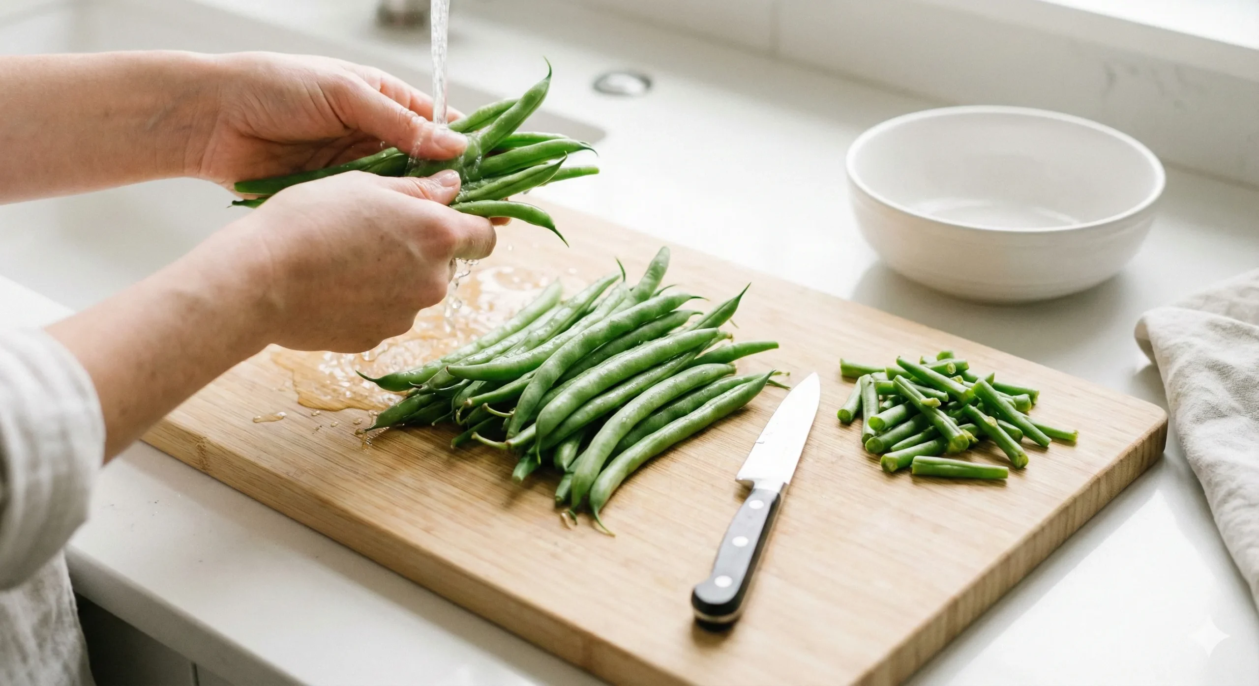 Start by rinsing your fresh green beans under cold water. Use a sharp knife to trim the ends, snapping off the tough stem ends. Aim for about 1-2 inches from the tip, ensuring they're neat and ready for cooking.