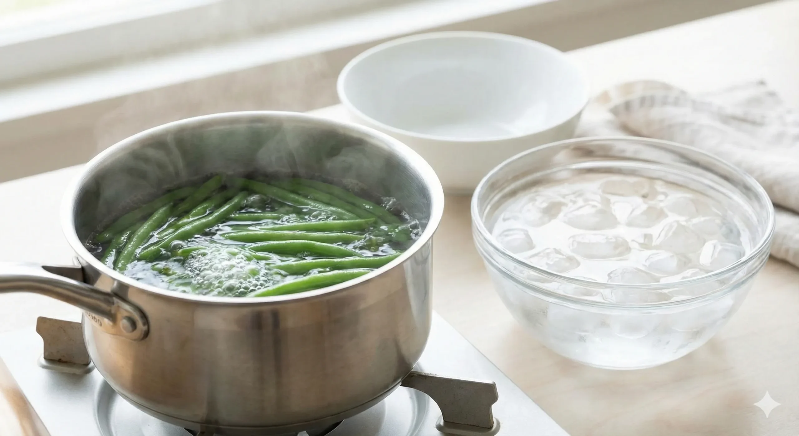 - Blanch the green beans in boiling salted water for 3-4 minutes until bright green, then immediately transfer to an ice bath to stop the cooking process.