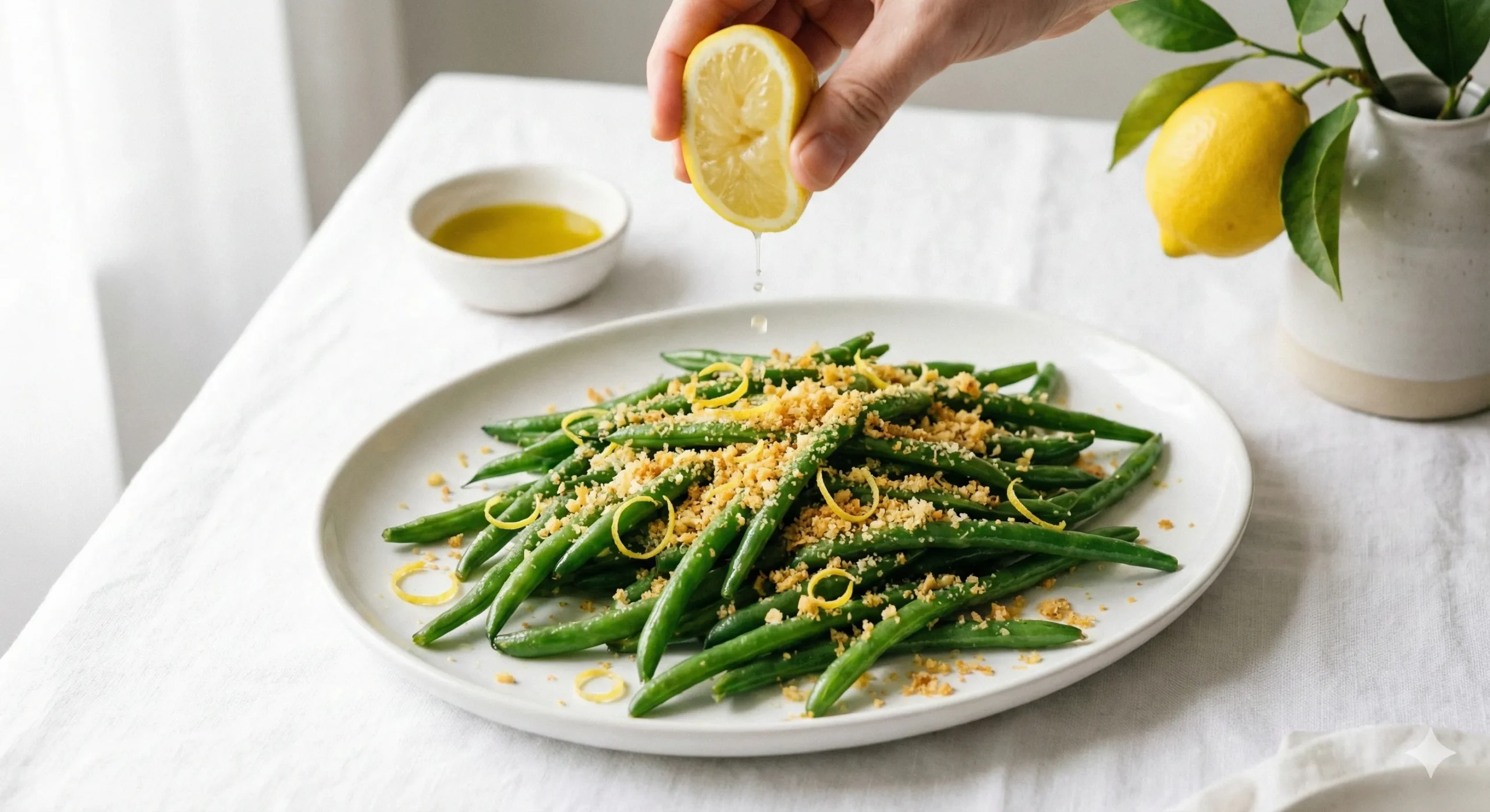 Transfer the sautéed green beans to a serving platter. Top generously with the toasted Parmesan crumbs and finish with a squeeze of fresh lemon juice. Serve immediately while the crumbs are crispy and the beans are warm.