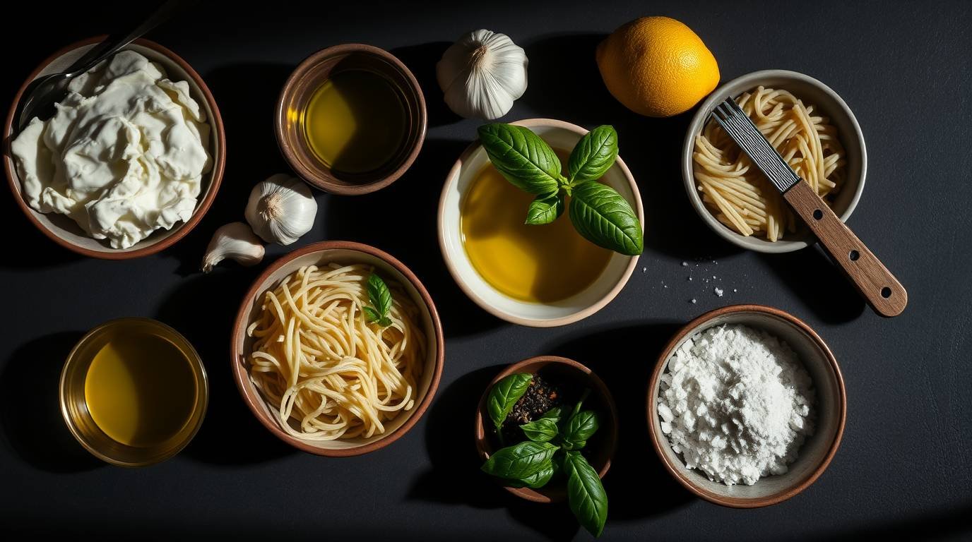 Have everything measured and ready: pasta, ricotta, lemon zest, lemon juice, olive oil, garlic, Parmesan, basil, salt, pepper—and adaptogen if using.