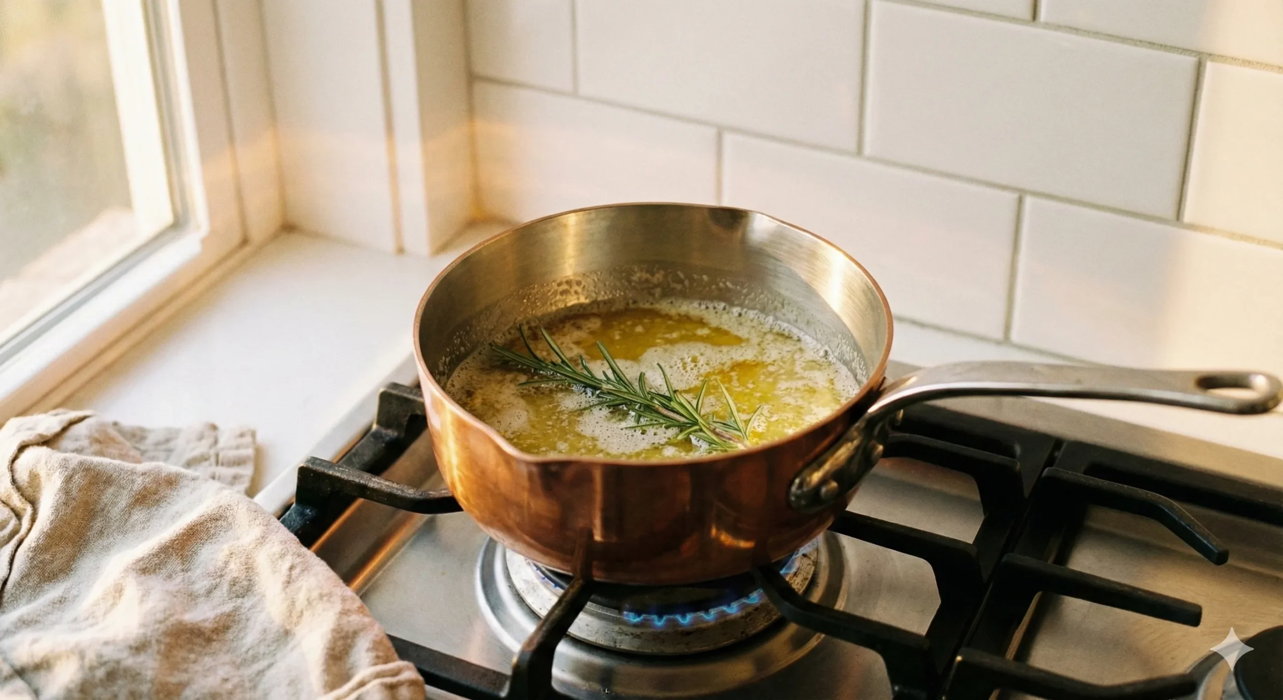 In a small pan, melt the butter over low–medium heat with a fresh rosemary sprig.