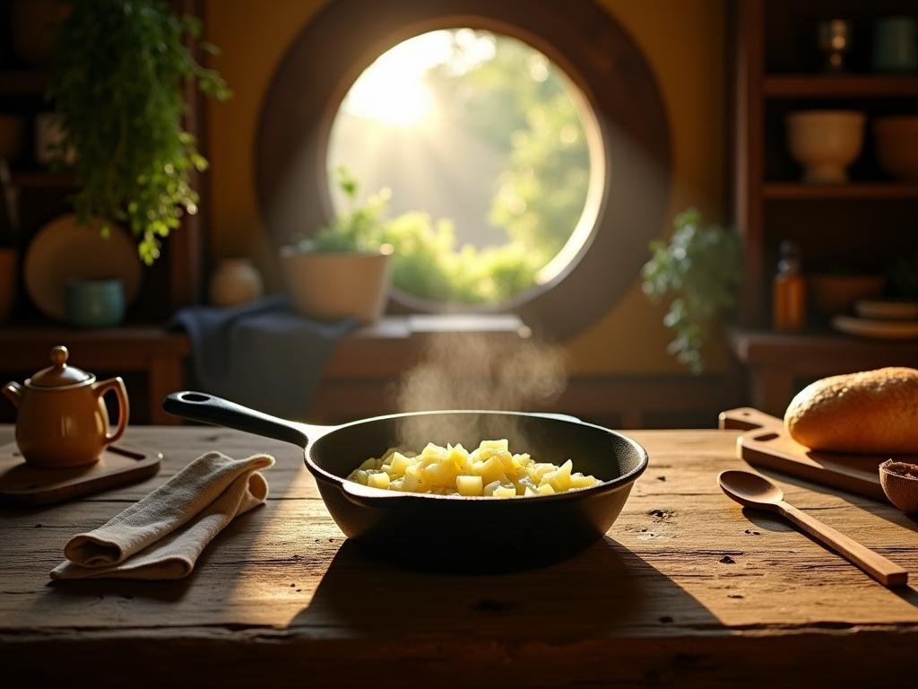 I woke to the scent of rain and earth — that ancient fragrance that whispers, “You are still alive.” The morning light slanted through the kitchen window, painting the wooden table in gold. In that quiet, I thought of the Shire — not as a place, but as a feeling. The kind of peace that comes from knowing you have enough: a warm skillet, a few mushrooms, and the patience to let them brown slowly.