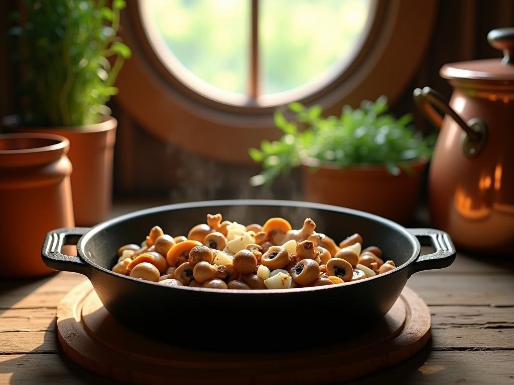 Rustic Shire style kitchen with a cast iron skillet filled with golden vegan mushroom and potato hash morning sunlight streaming through a round hobbit window pinit