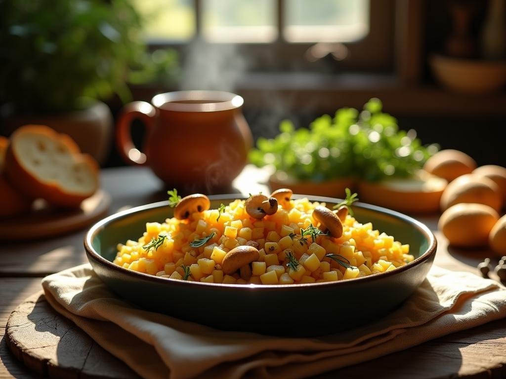 A rustic, earthy dish inspired by the meals of Middle-earth, combining savory mushrooms and golden potatoes for a hearty, vegan breakfast or brunch option.